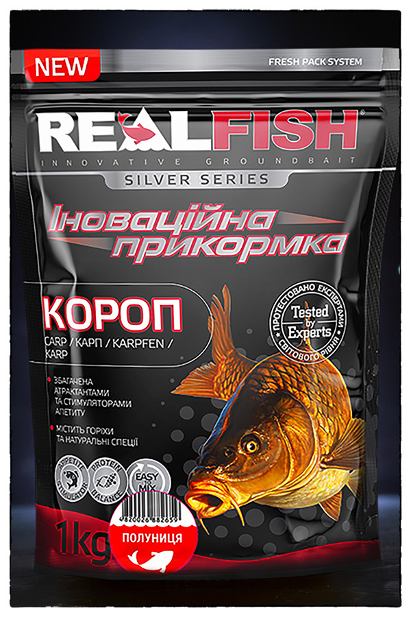 Прикормка Real Fish Карп Полуниця з високим вмістом протеїнів, виготовлена з натуральних інгредієнтів вищої якості, що пройшли спеціальну обробку, яка багаторазово посилила смак і аромат цієї суміші. Використовується для лову коропа, карася, линя та ляща в озерах та річках зі слабкою течією. Має у своєму складі великофракційні компоненти, які залучають до місця загодовування велику рибу.