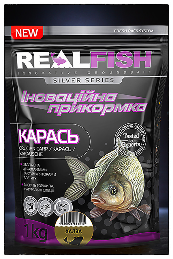 Прикормка Real Fish Карась Халва виготовлена за особливою технологією з натуральних інгредієнтів, що пройшли спеціальну обробку, яка багаторазово посилила смак і аромат цієї суміші. Має у складі біологічно активні речовини, які буквально притягують рибу в точку годування. Застосовується для лову більшості видів риб сімейства коропових: карася, коропа та линя в озерах, річках та каналах зі слабкою течією. Додавання в підгодовування консервованої кукурудзи, опариша, рубаного хробака максимально посилить ефективність підгодовування.